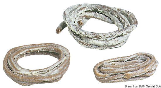 In fibre lunghe di cotone misto canapa e teflon a sezione quadrata per tenuta stagna degli astucci assi elica. Si ricorda che per un corretto funzionamento, la baderna deve essere montata in brevi spezzoni che formano ciascuno un solo anello.