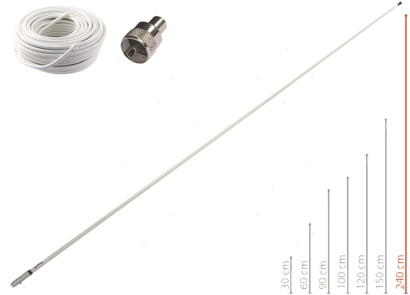 Antenna VHF RA1206 in Vetroresina per barche a motore. 100W / 6db / 156/162 MHz / 50 Ohm. Altezza 2,4 m. Completa di connettore e cavo coassiale da 4,5 m.