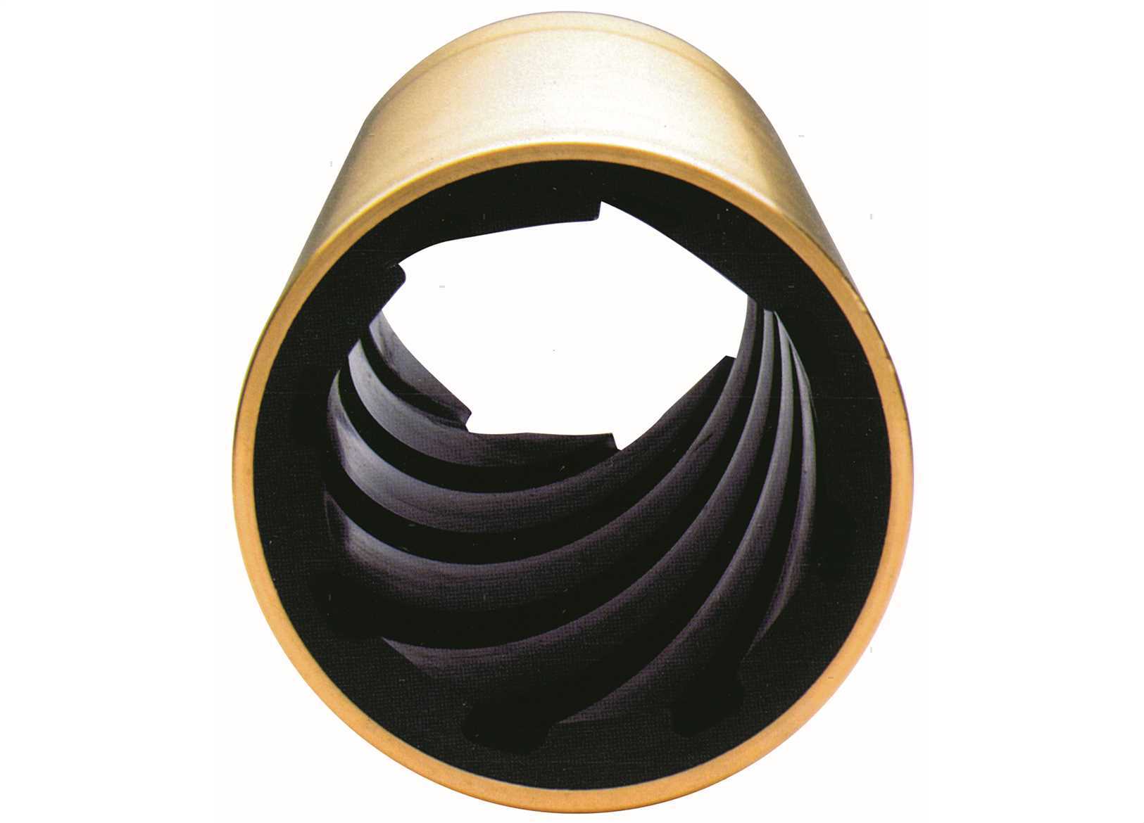 Boccole Idrolub ø interno e ø esterno metrico. Guscio in Ottone. ?Boccola con evoluzione destra (Dx)per elica con rotazione sinistra. ?Boccola con evoluzione sinistra (Sx)per elica con rotazione destra. ?L'asse porta-elica non ruota più in un supporto a forma poligonale, ma viene sostenuto (guidato) in tutta la sua circonferenza, riducendo le vibrazioni.La rotazione dell'asse provoca un elevato effetto pompante con un incremento notevole della velocità dell'acqua nei canali ed un migliore raffreddamento, lubrificazione e pulizia dei canali stessi.