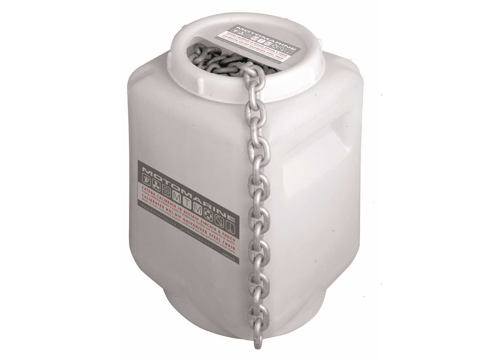 Catena calibrata in Acciaio Zincato a caldo di qualità superiore per verricelli salpa ancora. Produzione controllata con elevato carico di rottura. Matasse da 30, 50, 75 o 100 metri.