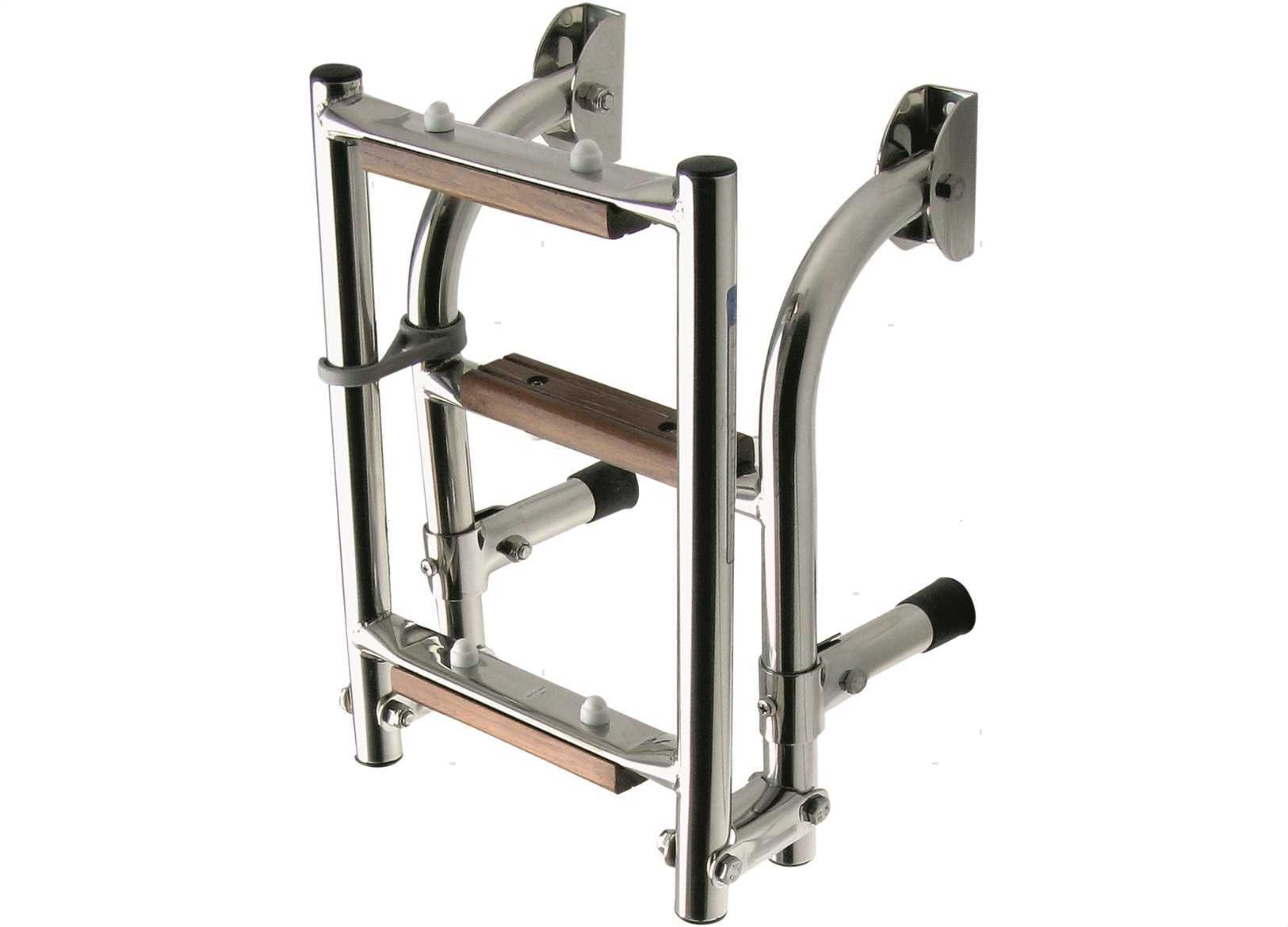Scaletta pieghevole in Acciaio Inox con interasse stretto. ?Gradino rivestito con Legno trattato. ?Si usa quando manca spazio sullo specchio di poppa.