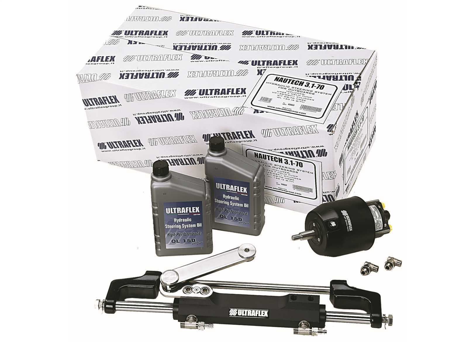 Kit timoneria Nautech1 per motori fuoribordo:?Mercury 2 e 4T da 100 a 300 HP - Yamaha 4T da F70 a F150 e da F200 a F300 - Honda 4T 75/90/115A e da 135 a 250 HP - Suzuki 4T da 100 a 175 HP - Tohatsu 4T da 70 a 115 HP - Selva 2T da 80 a 150 e 4T da 150 HP - Johnson 4T da 90 a 140 HP.?Pratico e facile da installare, comprende:?1 Pompa UP28F (Cod MTM 4656601), 4.3 giri volante da banda a banda?1 Cilindro UC128-OBF/1 (Cod MTM 4655014)?2 Litri olio idraulico Ultraflex.?I passaparatia si utilizzano per il passaggio dei 2 tubi idraulici a poppa. Da completare con kit 2 tubi idraulici da 5/16 con raccordo da 10 mm.??Kit timoneria Nautech2 per motori fuoribordo:?Evinrude 2T da 75 a 300 HP - Yamaha 2T da 75 a 300 HP e 4T da F200 a F250 (<2007) - Suzuki 4T da 70 a 90 e da 200 a 300 HP - Tohatsu 2T da 115 a 140HP - Selva da 100 a 115 HP (<2007) - Johnson 2T da 90 a 175 e 4T da 200 a 225 HP.?Pratico e facile da installare, comprende:?1 Pompa UP28F (Cod MTM 4656601), 4.3 giri volante da banda a banda?1 Cilindro UC128-OBF/2 (Cod MTM 4655015)? 2 Litri olio idraulico Ultraflex?I passaparatia si utilizzano per il passaggio dei 2 tubi idraulici a poppa. Da completare con kit 2 tubi idraulici da 5/16 con raccordo da 10 mm.?
