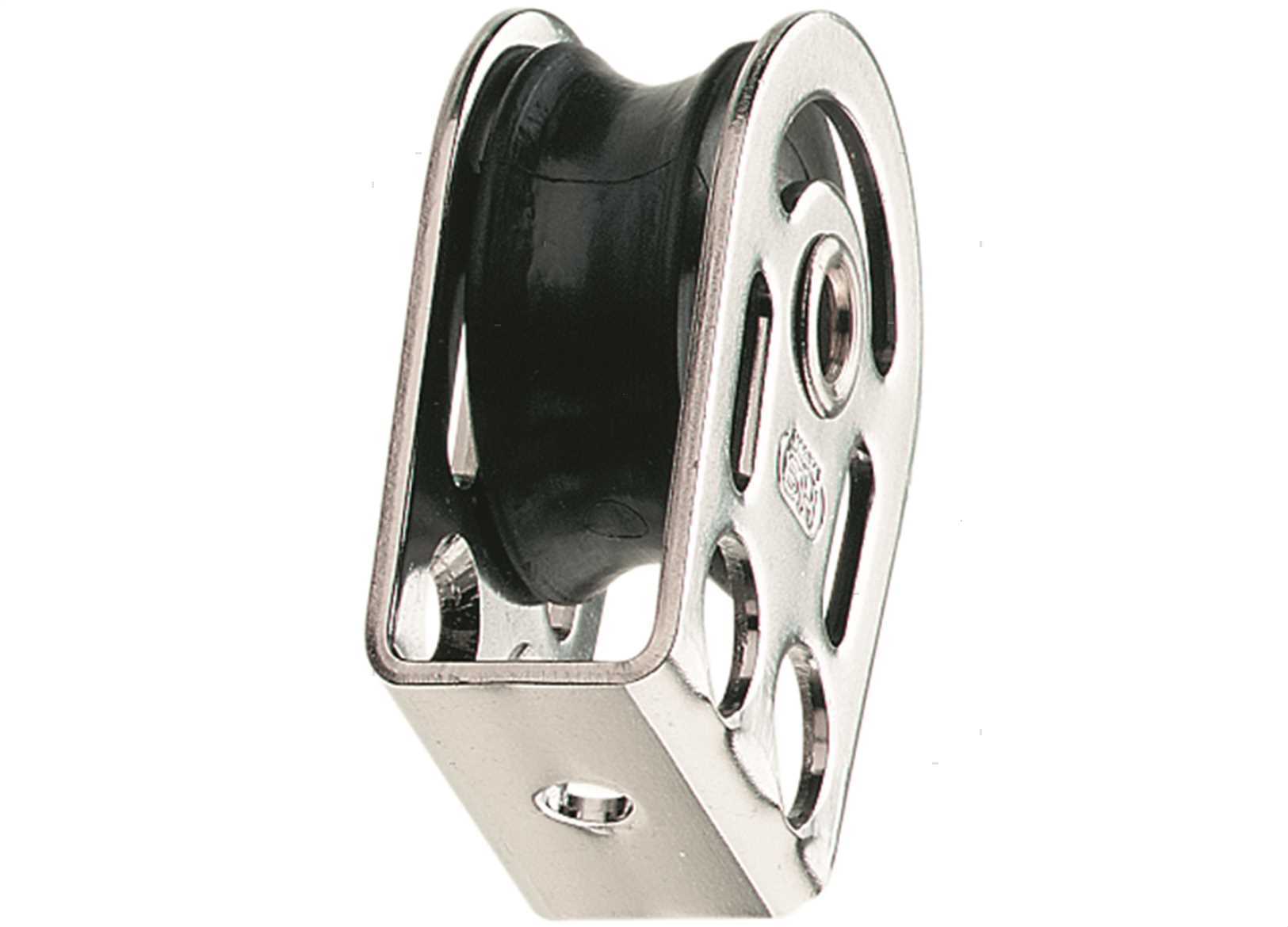 Rinvio da ponte HS con puleggia su sfere. Distanza asse puleggia - base: 25 mm. Gabbia in Acciaio Inox. Scotta <8 mm / CR = 300 Kg.