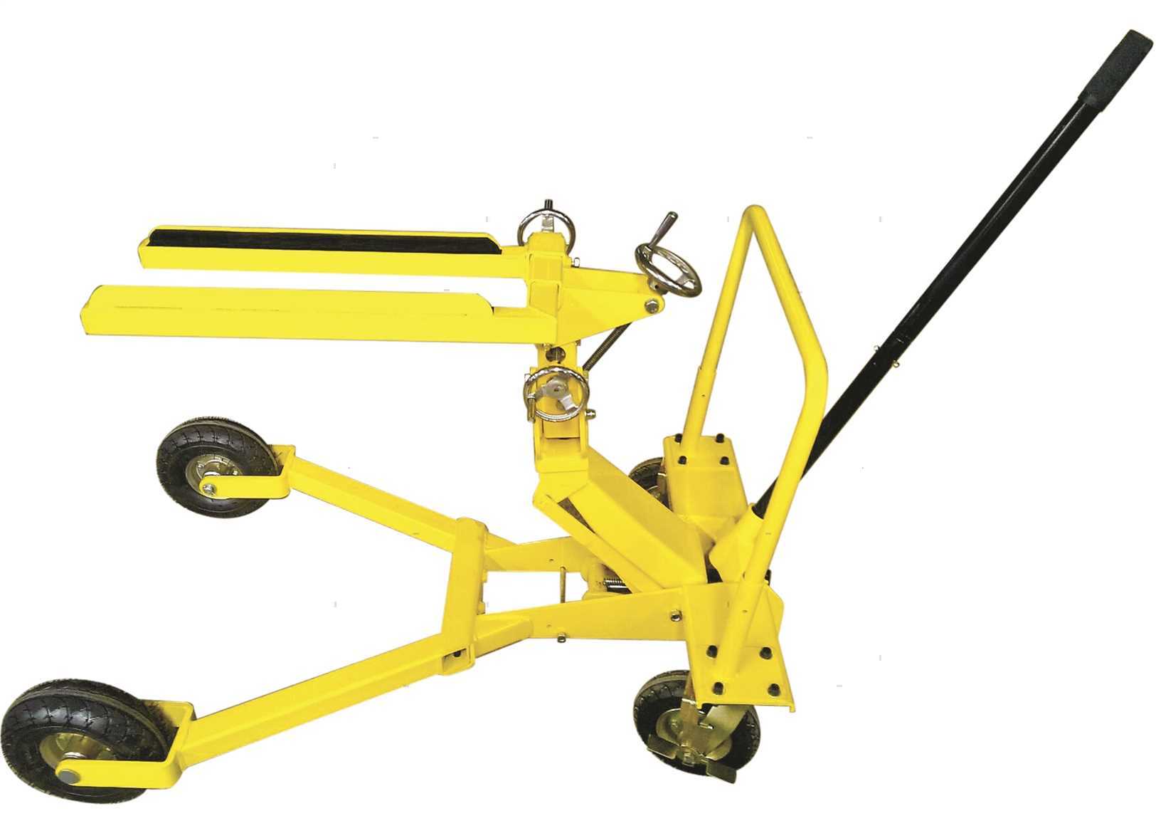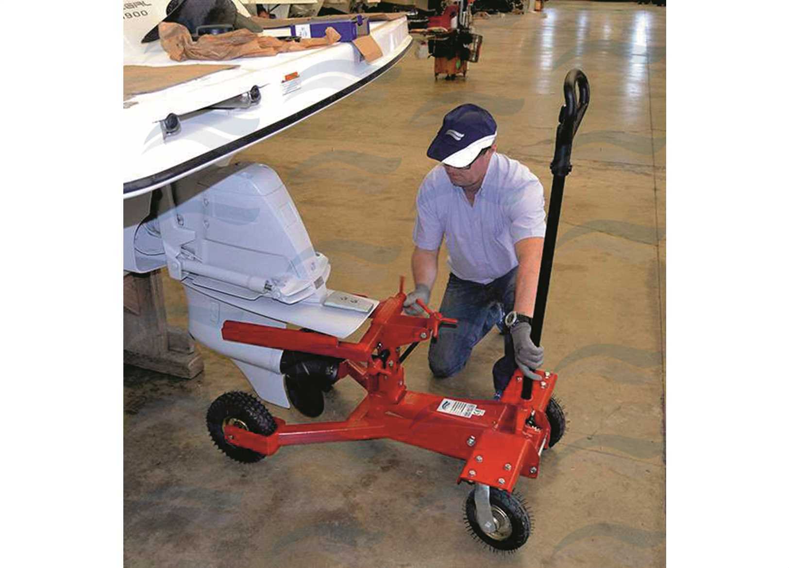 Cavalletto idraulico Engine Jack per sollevare il piede poppiero da dietro. Grazie alle 4 ruote pneumatiche può muoversi su qualsiasi terreno. Le forche sono regolabili in larghezza ed altezza. Totalmente smontabile e pieghevole.