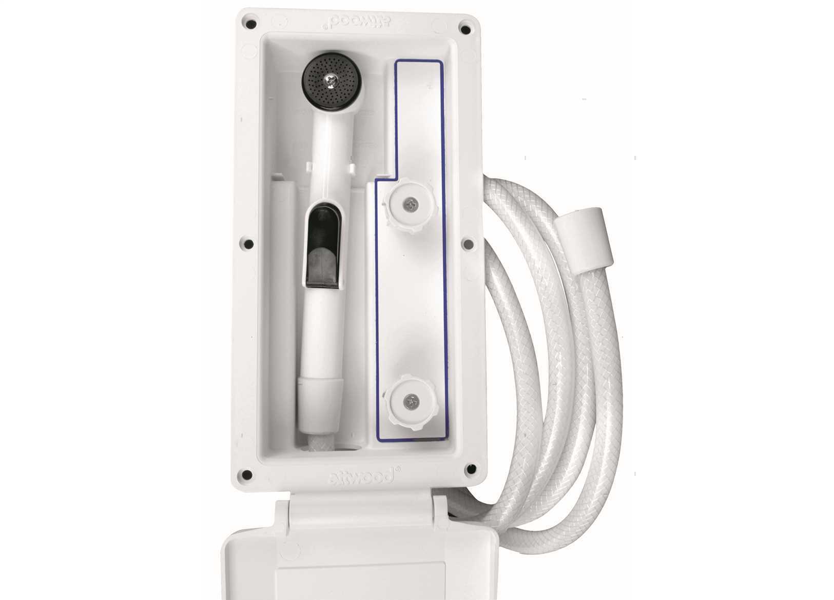 Kit doccia con miscelatori acqua calda e fredda e tubo flessibile da 185 cm. Coperchio e cassa in Plastica antiurto resistente ai raggi UV. Montaggio a incasso verticale e orizzontale.