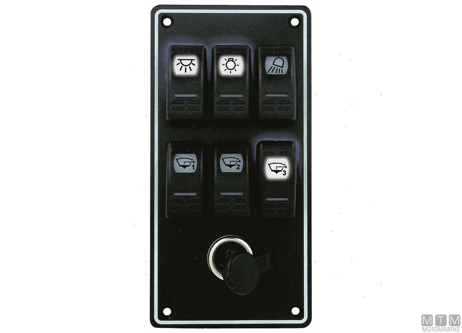 Pannello anodizzato impermeabile in Poliuretano con interruttori precablati, fusibili, spie LED ed etichette prestampate. Il 2102707 è completo con presa accendisigari 12V.