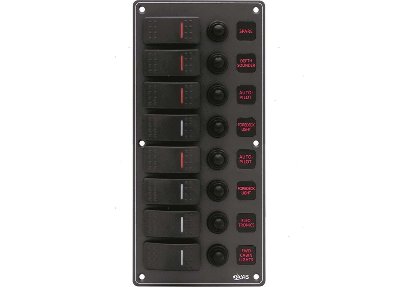 Pannelli 12/24V di qualità superiore in Alluminio compatti e impermeabili IP66. Precablati, con interruttori impermeabili dotati di spie LED rosse e valvole automatiche reinseribili con cappuccio di protezione. Il primo interruttore è (ON)-OFF per segnalazione acustica. Compresi di 30 etichette prestampate da applicare negli alloggi retroilluminati LED. Montaggio verticale oppure orizzontale.