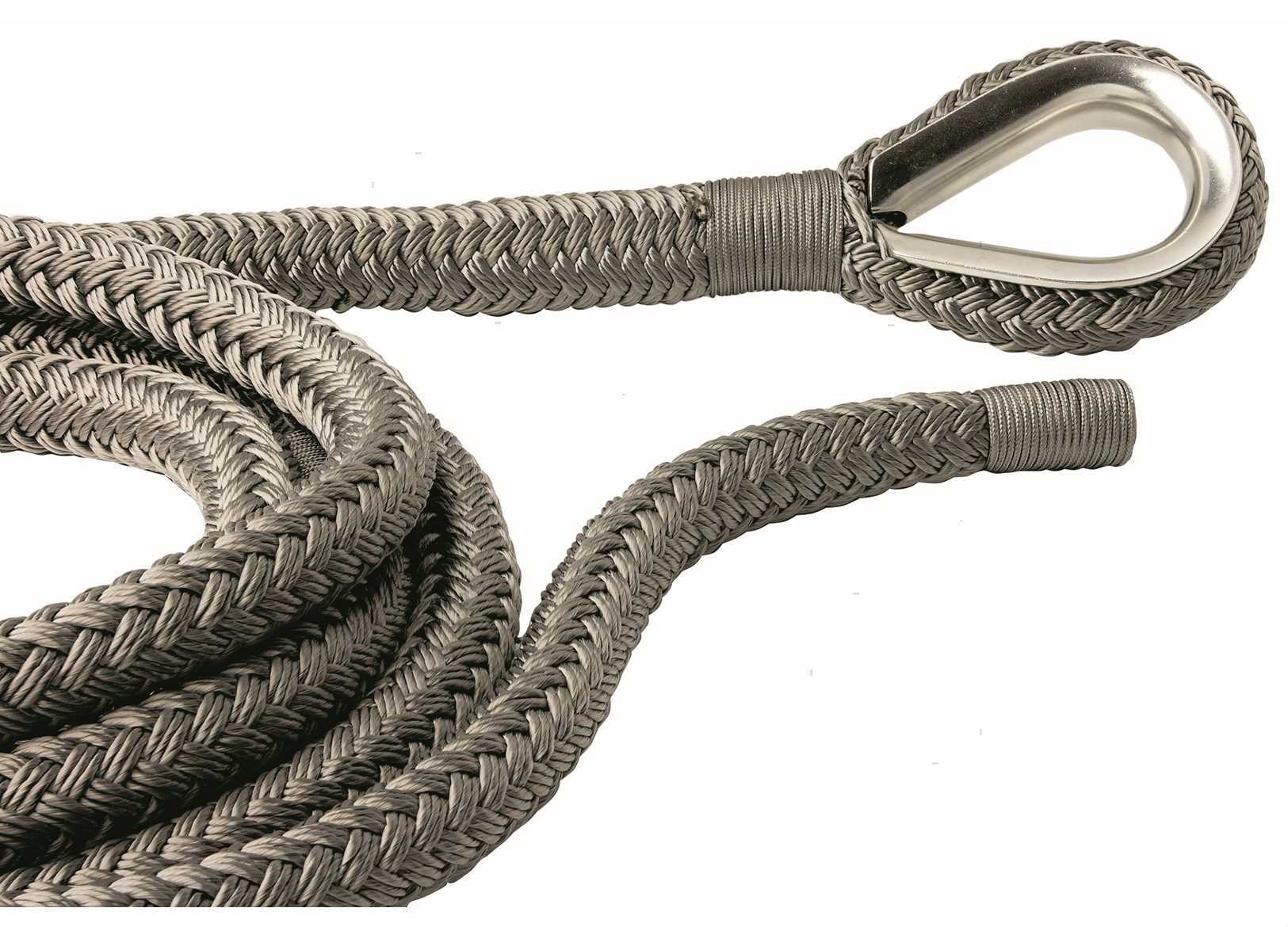 Treccia da ormeggio pronta con redancia in Acciaio Inox impiombata e rifinita a mano. Anche il terminale viene cucito e rifinito a mano per evitare imperfezioni. Robustissima e morbida, lavorazione a 16 fusi in Poliestere alta tenacità. La guaina è costruita e trattata per la massima resistenza all'abrasione. Non galleggia. daN= carico di rottura in Kg