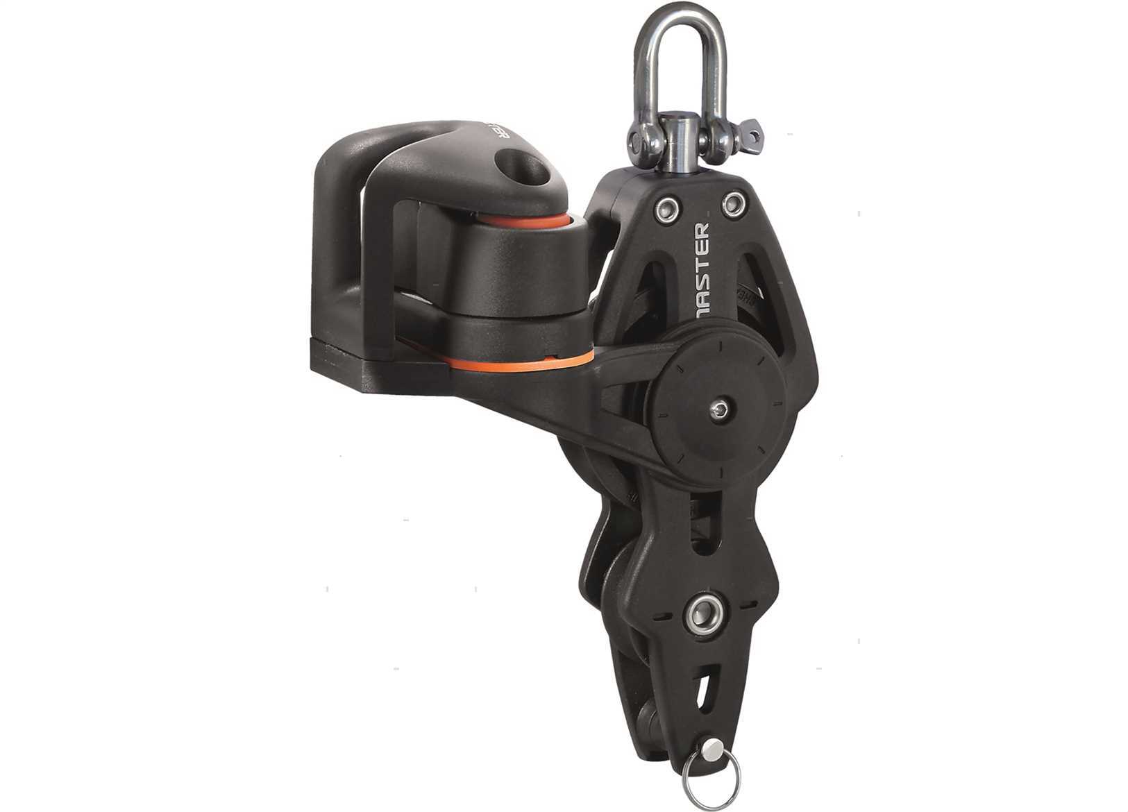 Bozzelli Master su boccola con grande capacità di carico e puleggia da 50 mm. Cassa in materiale composito ultra leggero rinforzato con fibra e UV resistente. Il grillo girevole può essere bloccato in due posizioni grazie alla leva di blocco. ? NB. Il carico di lavoro/rottura dei bozzelli con strozza scotte sono relativi allo strozza scotte.