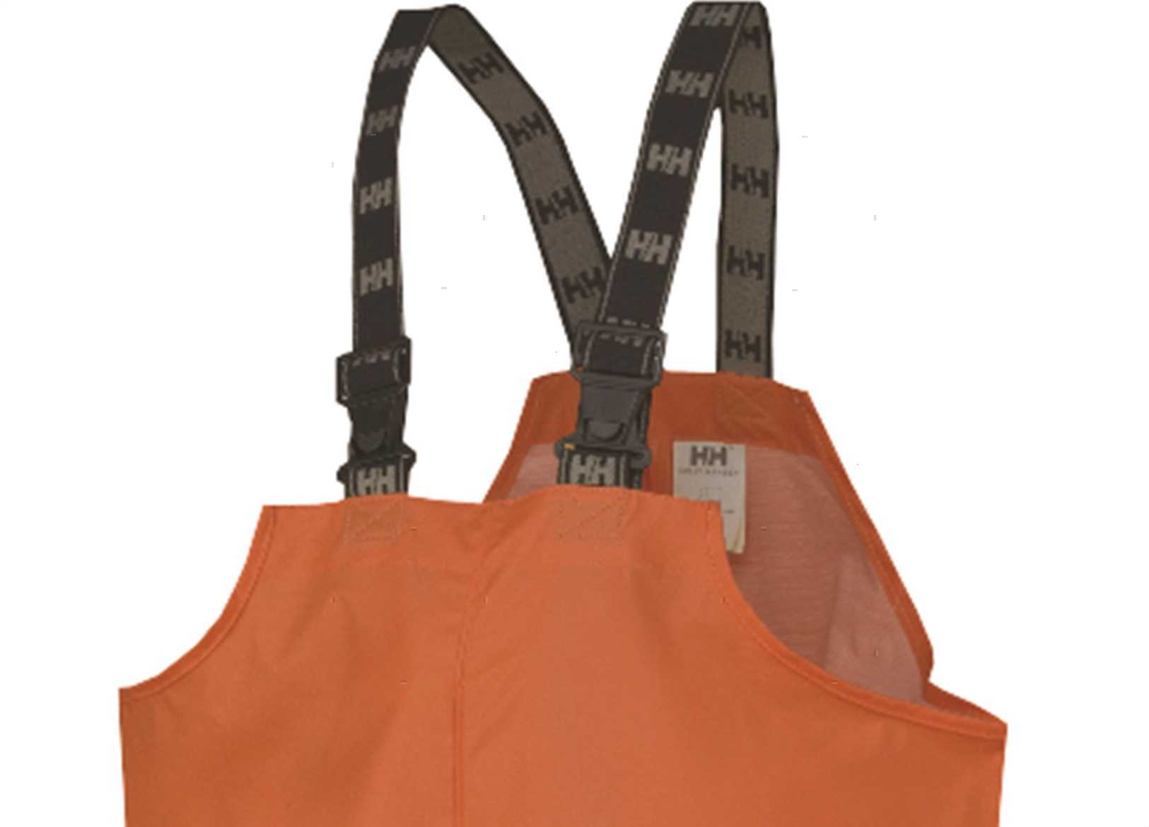 Salopette Helly Hansen Mandal Bib in tessuto di Poliestere 410 g/m2 spalmato di PU ideale per proteggersi dall'acqua durante la pesca o in qualsiasi attivitą a bordo e in banchina. ?Con tasca frontale interna con zip, bretelle elastiche regolabili e bordo inferiore regolabile con bottoni.