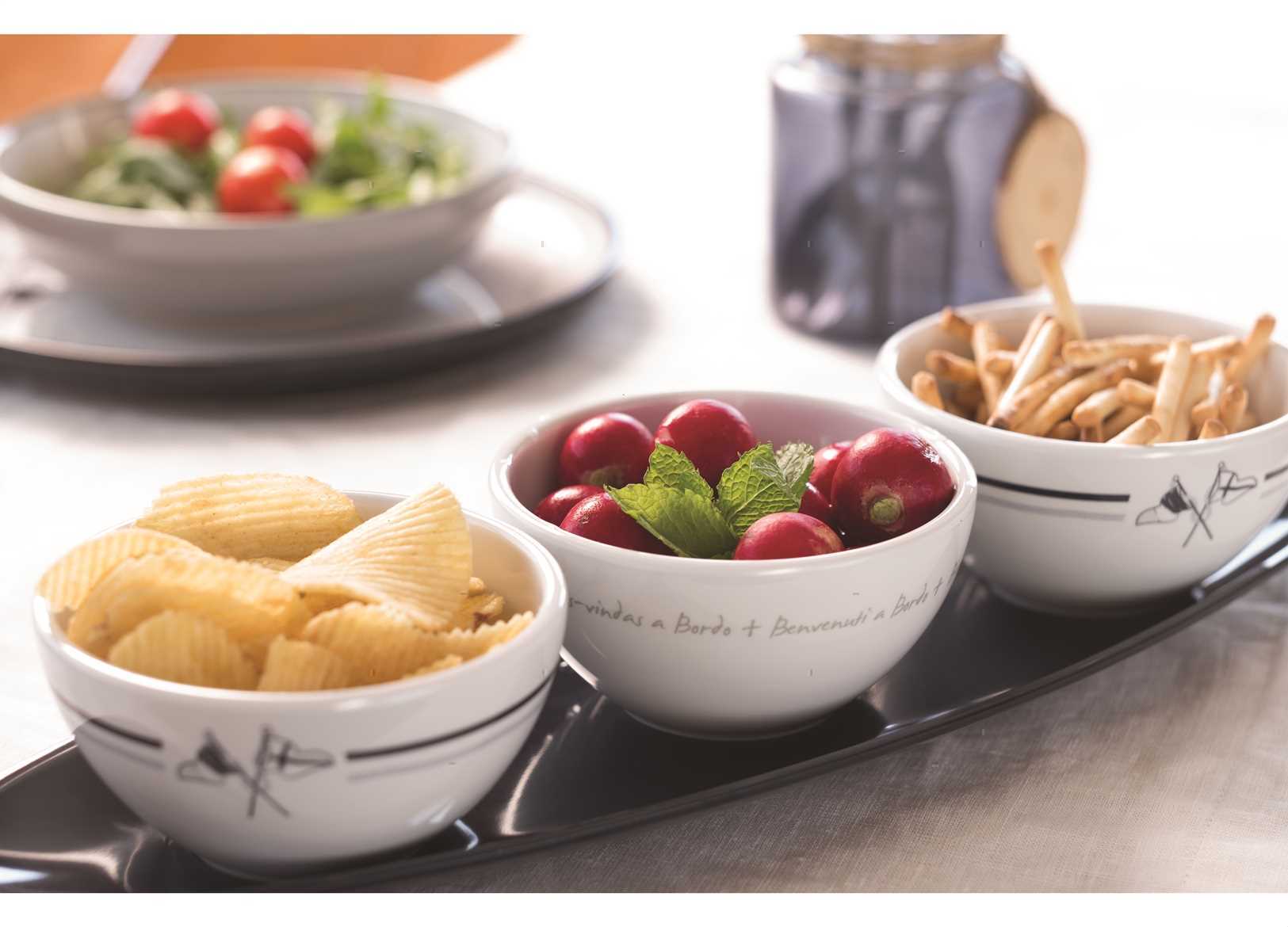 Set di 3 ciotole snack con sottopiatto ovale con decoro Welcome On Board. In Melamina garantita 100% per uso alimentare. Lavabile in lavastoviglie, infrangibile e anti-macchia.