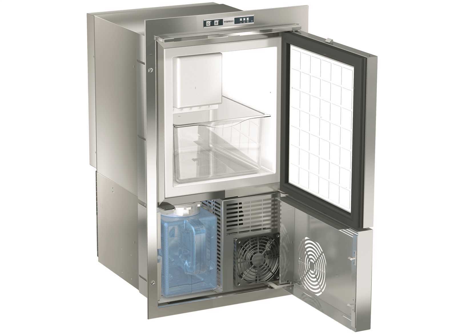 Fabbricatore di ghiaccio meccanico con cassa esterna in Acciaio Inox e unità refrigerante integrata. Con pannello comando impermeabile a LED che permette di impostare il freezer e controllare il livello dell'acqua nelle versioni refill. Grazie al profilo di fissaggio in dotazione l'anta si può installare a incasso totale oppure parziale. Nuova apertura con maniglia Steelock Vent Position che consente l'aerazione durante i periodi di non utilizzo.?Alimentazione 220V/180W, produzione ghiaccio 8 Kg/24h. ?Disponibile in due versioni:?Versione Hydro che può essere allacciata al sistema idrico dell'imbarcazione?Versione Refill con serbatoio d'acqua interno da 7L che consente l'utilizzo di acque minerali per la produzione dei cubetti.? H = Altezza ?W = Larghezza ?L = Lunghezza