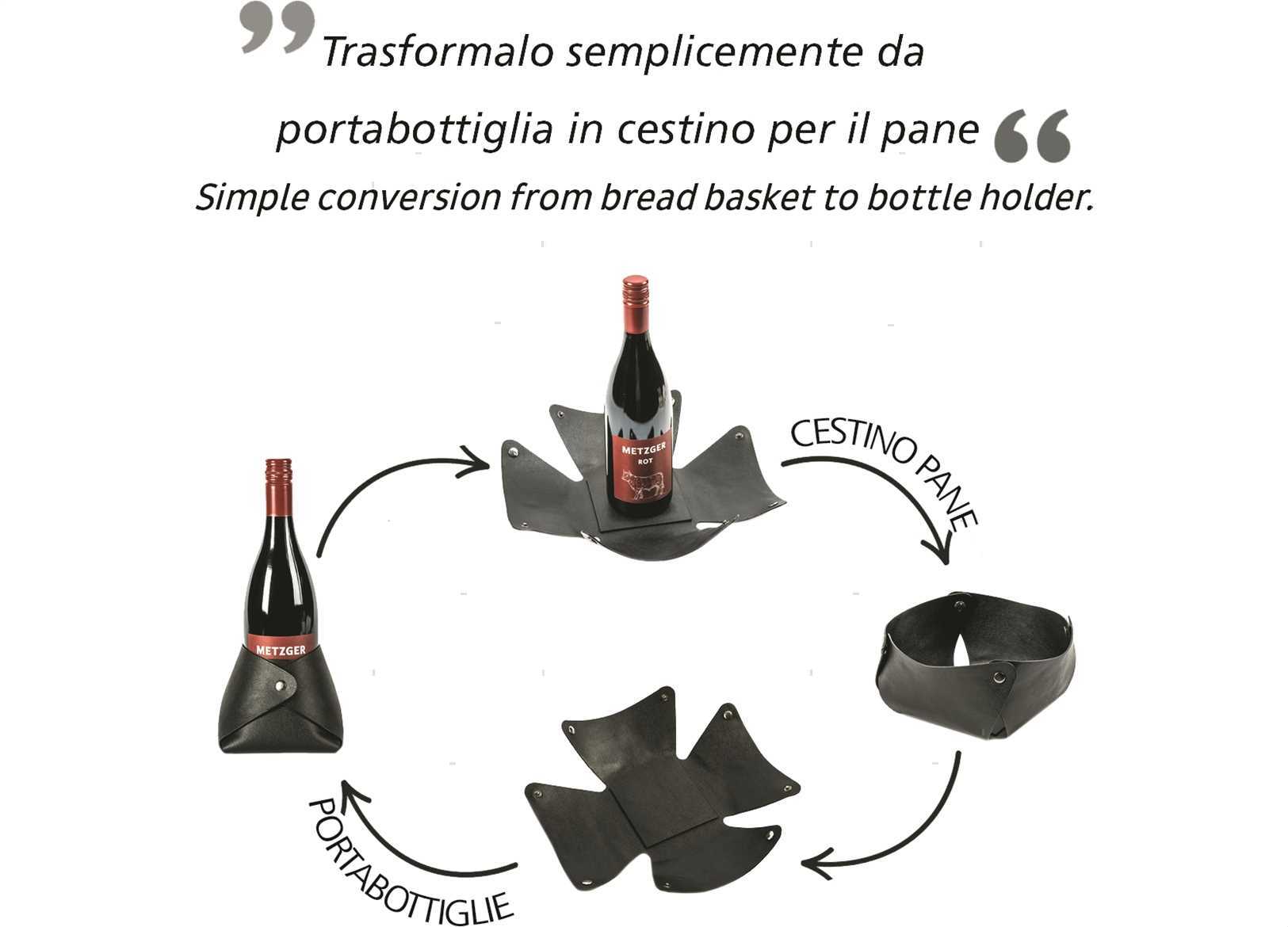 Portabottiglie trasformabile in cestino per il pane con magneti integrati e superficie antiscivolo che aderisce perfettamente al vassoio metallico della linea Silwy. Fatto a mano, dal design minimal ma dal look esclusivo in pelle.