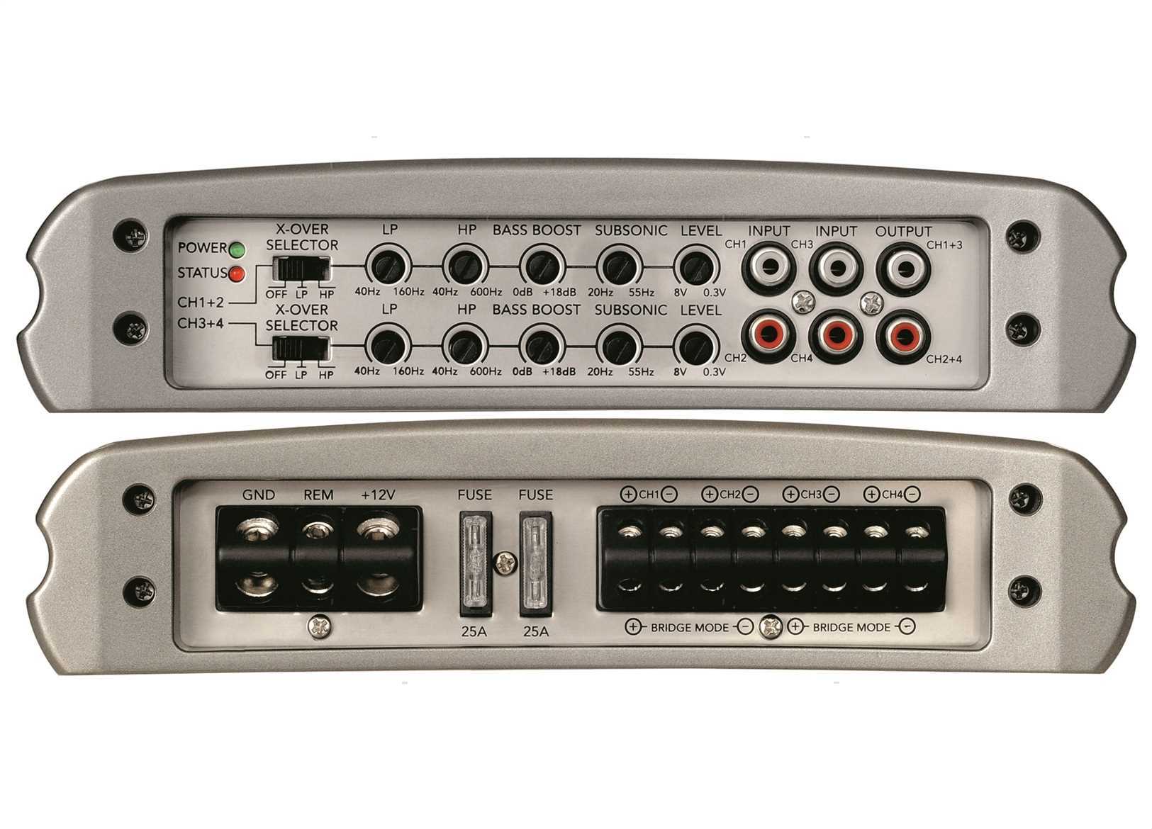 Amplificatore marino Fusion MS-AM504 classe AB a quattro canali completo di filtro subsonico e bass/crossover variabile.