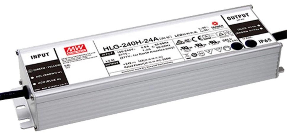 L'Alimentatore Switching HLG-240H-24A trasforma la tensione di rete alternata a 100-220Vac, in tensione di uscita continua (Vcc) con una potenza necessaria ad alimentare i fari Bluefin LED a 24V.