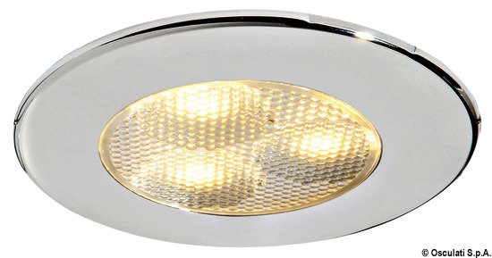 Corpo in acciaio inox. Lente in vetro satinato. Doppio sistema di fissaggio: con viti nascoste o con molle interne inox.