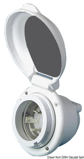 Presa con corpo in Luran resistente UV, copertura posteriore protezione cavi, contatti in ottone argentato. Spina in policarbonato + Moplen con sistema blocca cavo e contatti in ottone argentato. Cappuccio proteggi spina in PVC con ghiera a rotazione rapida in Luran resistente UV. Voltaggio 220/110. Amperaggio max 30 A.