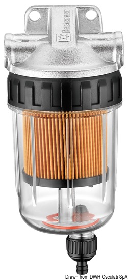 Fabbricato in alluminio anodizzato, con vaschetta trasparente smontabile per la sostituzione della cartuccia filtrante o sua pulizia.